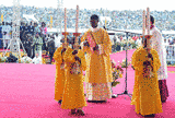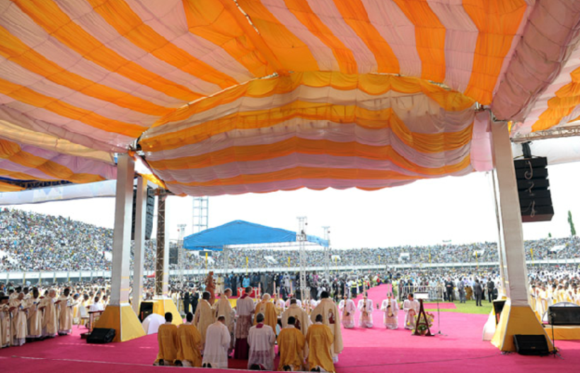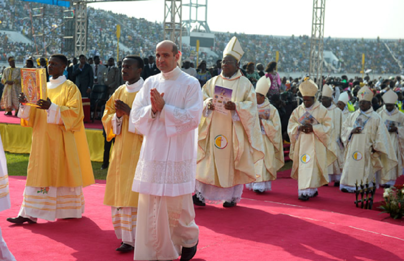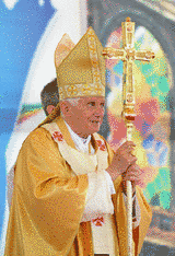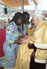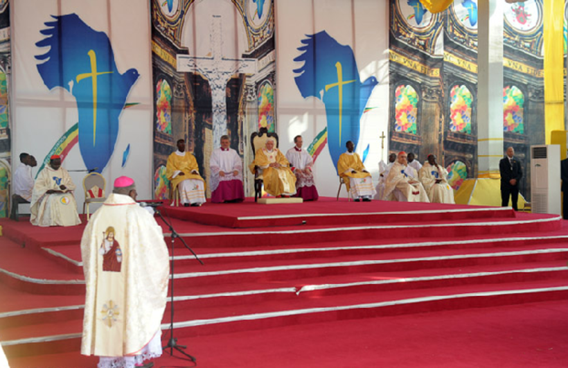 Following in the footsteps of my blessed predecessor Pope John Paul II, it is a great joy for me to visit for the second time this dear continent of Africa, coming among you, in Benin, to address to you a message of hope and of peace. I would like first of all to express my cordial gratitude to Archbishop Antoine Ganyé Cotonou, for his words of welcome and to greet the Bishops of Benin, as well as the Cardinals and Bishops from various African countries and from other continents. To all of you, dear brothers and sisters, who have come to this Mass celebrated by the Successor of Peter, I offer my warm greetings. I am thinking certainly of the faithful of Benin, but also of those from other French-speaking countries, such as Togo, Burkina Faso, Niger and others. Our Eucharistic celebration on the Solemnity of Christ the King is an occasion to give thanks to God for the 150 years that have passed since the beginnings of the evangelization of Benin; it is also an occasion to express our gratitude to him for the Second Special Assembly of the Synod of African Bishops which was held in Rome a few months ago.