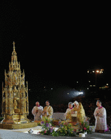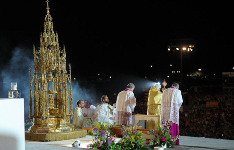 And so I now ask you to “abide” in the adoration of Christ, truly present in the Eucharist. I ask you to enter into conversation with him, to bring before him your questions and to listen to his voice. Dear friends, I pray for you with all my heart. And I ask you to pray for me. Tonight let us ask the Lord to grant that, attracted by the beauty of his love, we may always live faithfully as his disciples. Amen.]