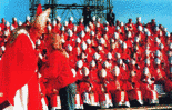 With them and with all those here present before this Portico, there comes alive before our eyes the great meeting of the pilgrims before the doors of the Basilica of Santiago, described in the Codex Callistinus: "Countless people of all nations go there... There is no language nor dialect which is not heard there... The doors of the Basilica never close, neither by day nor by night... Everyone goes here exclaiming: "E-ultr-eia (Forward, yes!) E-sus-eia (Up, yes!)". Yes. For a moment Santiago de Compostela is today the meeting tent, the object of pilgrimage, the eloquent sign of the Church, pilgrim and missionary, penitent and wayfarer, praying and evangelizing, which travels all the paths of history "amid the persecutions of the world and the consolations of God, announcing the cross and death of the Lord until he comes" (cf Lumen Gentium, 8).
